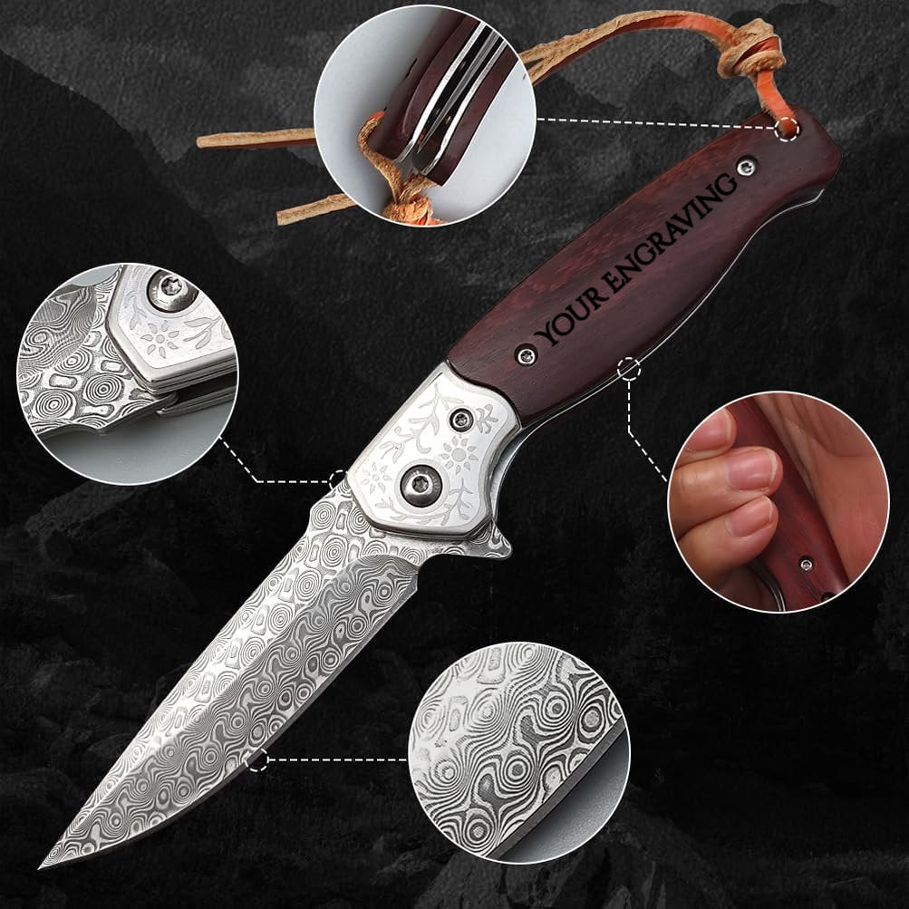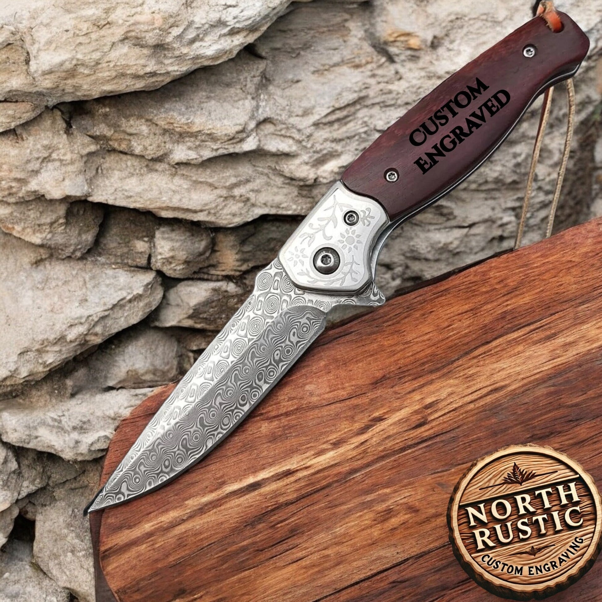 Engraved VG10 Damascus Folding Knife | Personalized Pocket Knife | Rose Wood Handle Knife | Wedding Husband Anniversary Father Gift