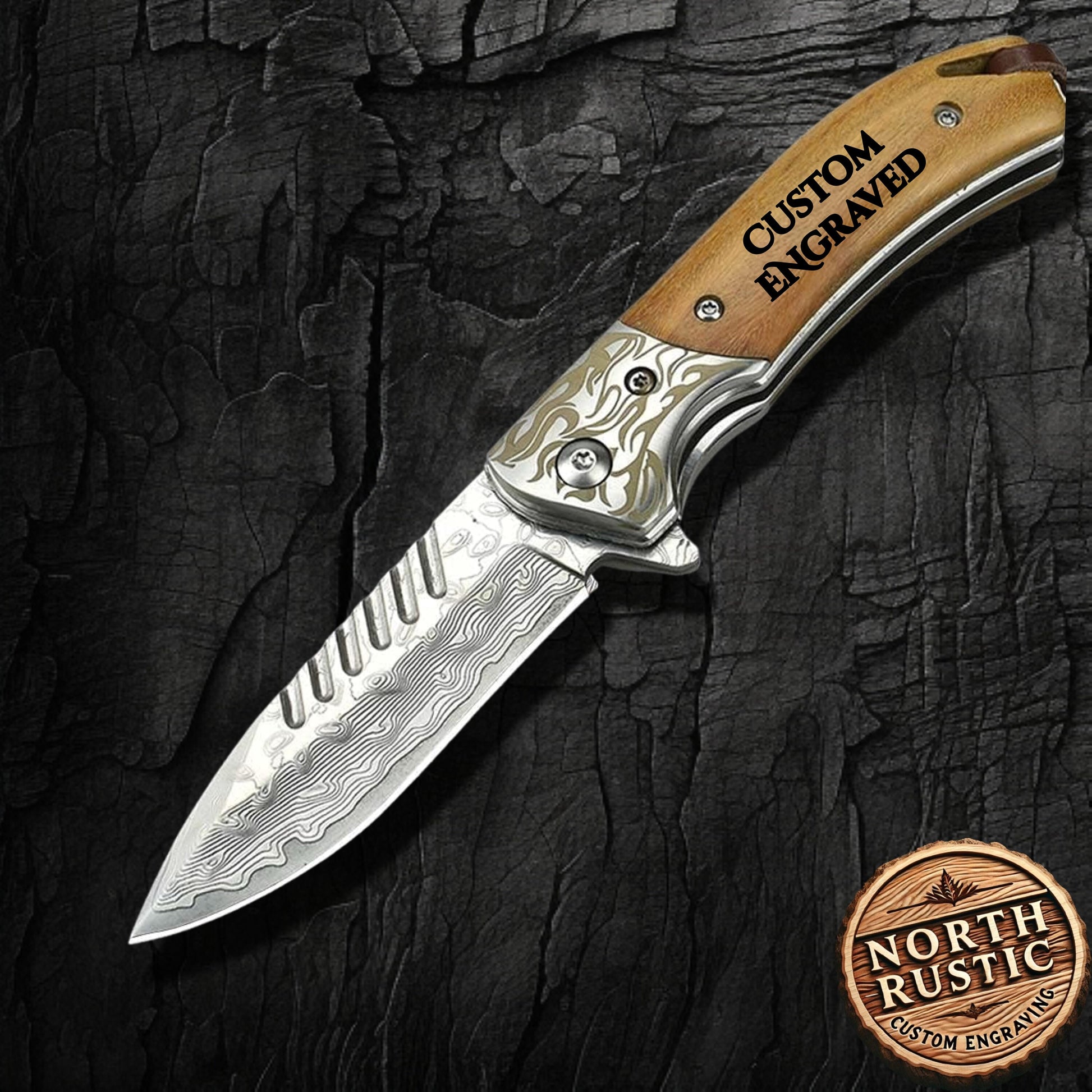 Engraved VG10 Damascus Folding Knife | Personalized Pocket Knife | Rose Wood Handle Knife | Wedding Husband Anniversary Father Gift