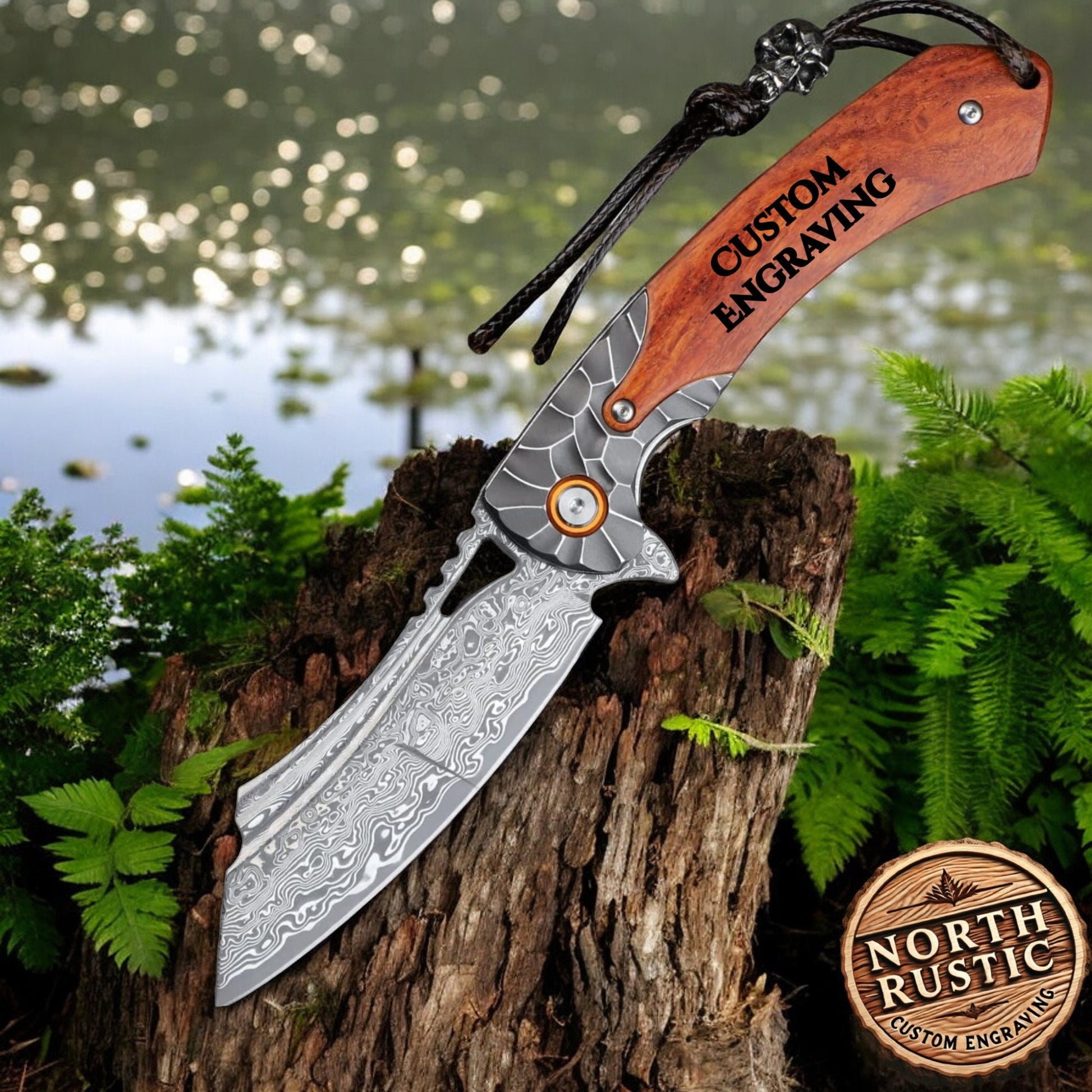 Engraved VG10 Damascus Folding Knife | Personalized Pocket Knife | Rose Wood Handle Knife