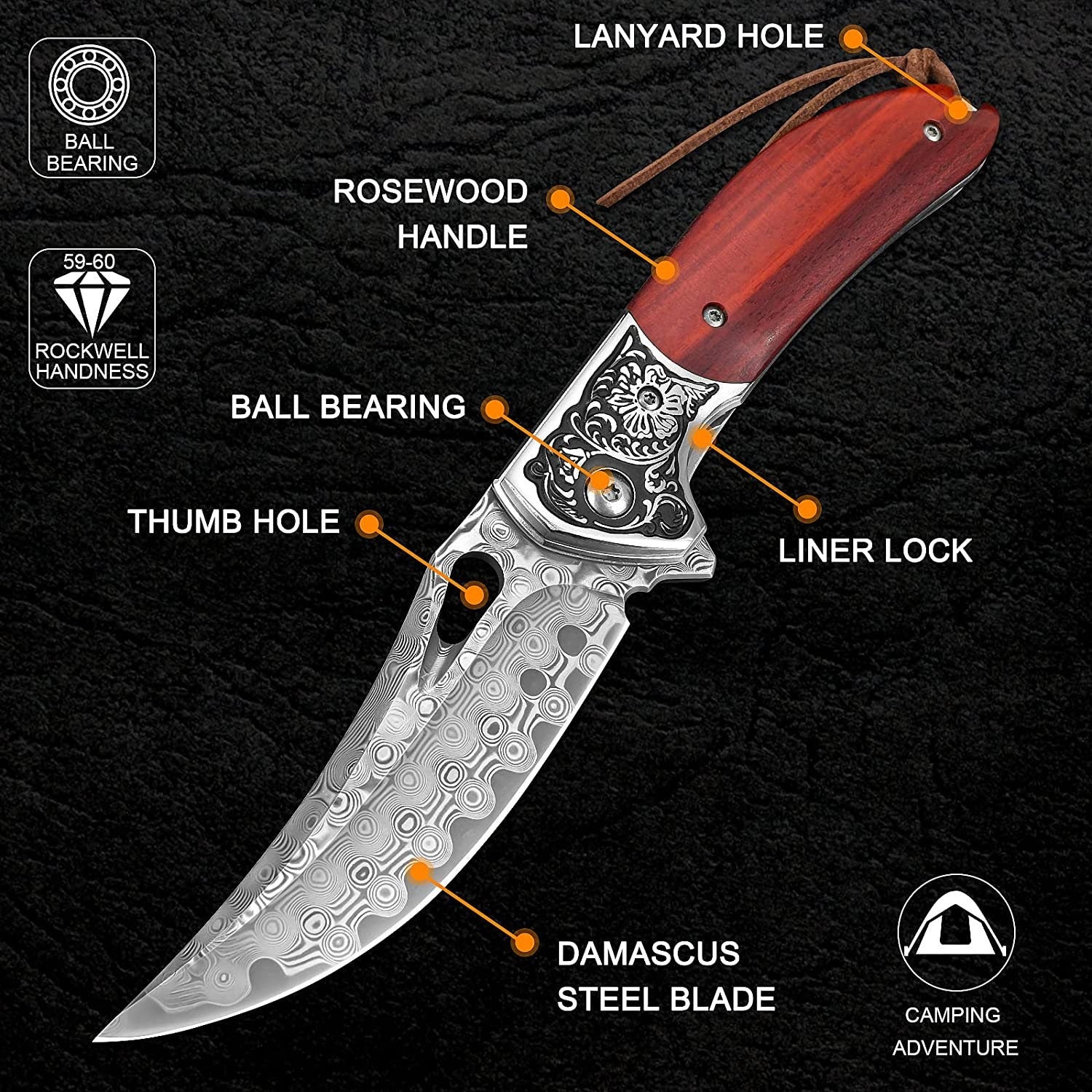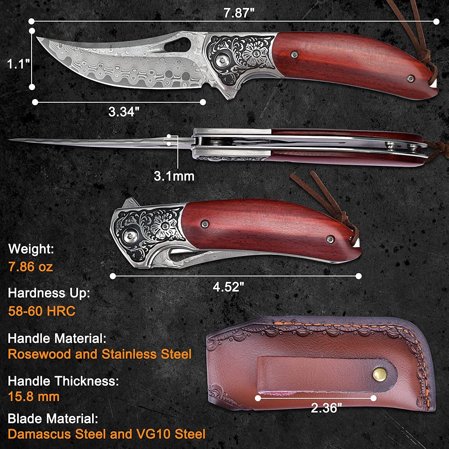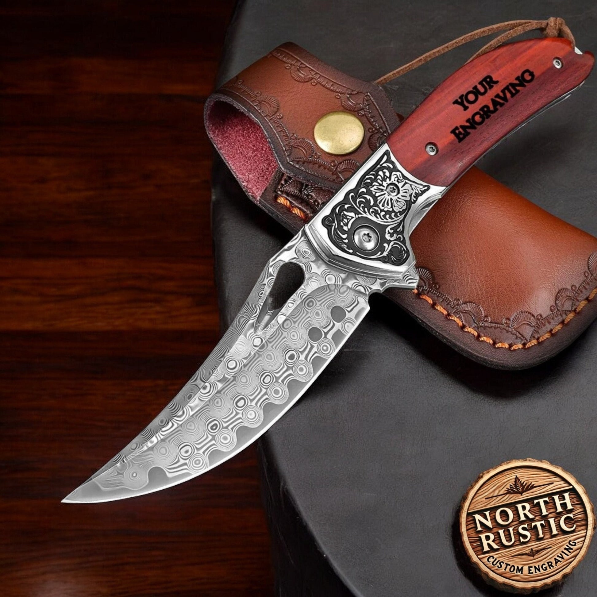 Engraved VG10 Damascus Pocket Knife, Personalized Folding Knife, Unique Rose Wood Handle, Custom Engraving Gift Knife | VP113
