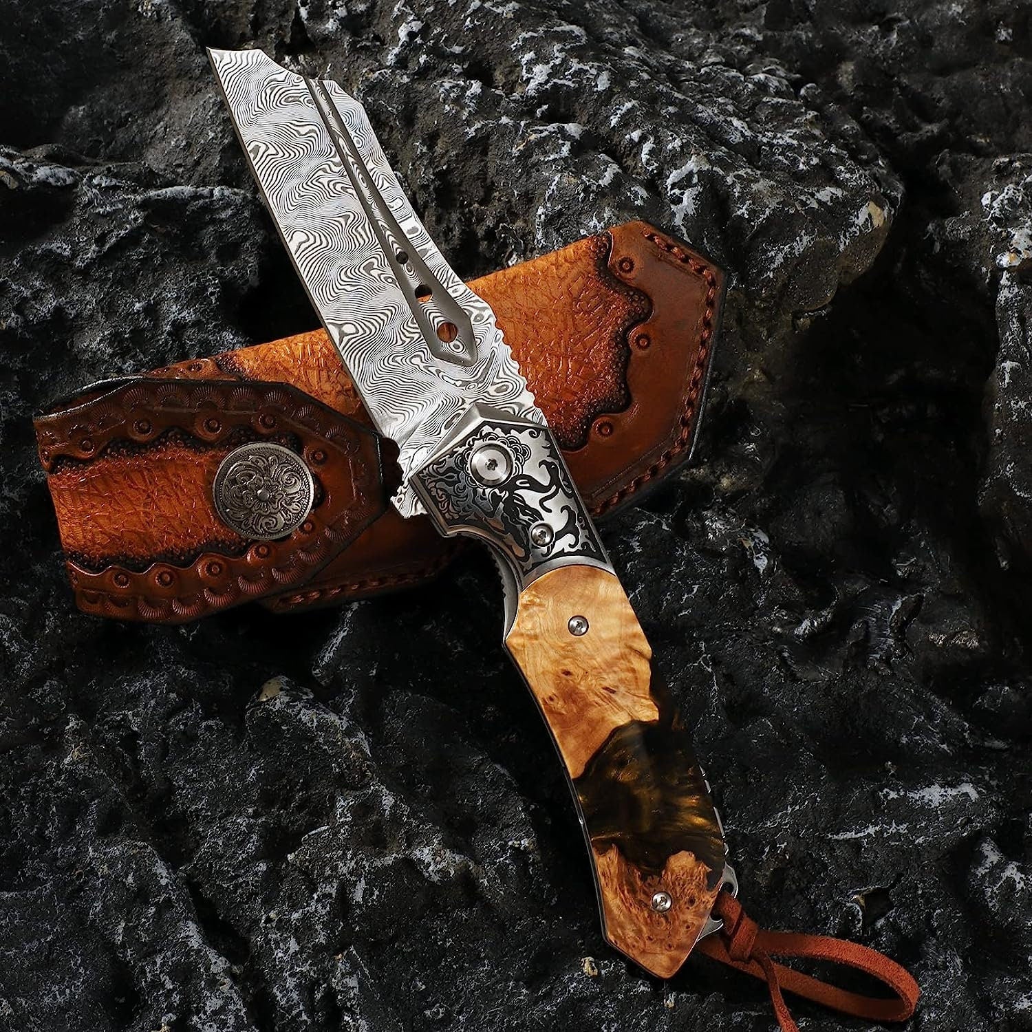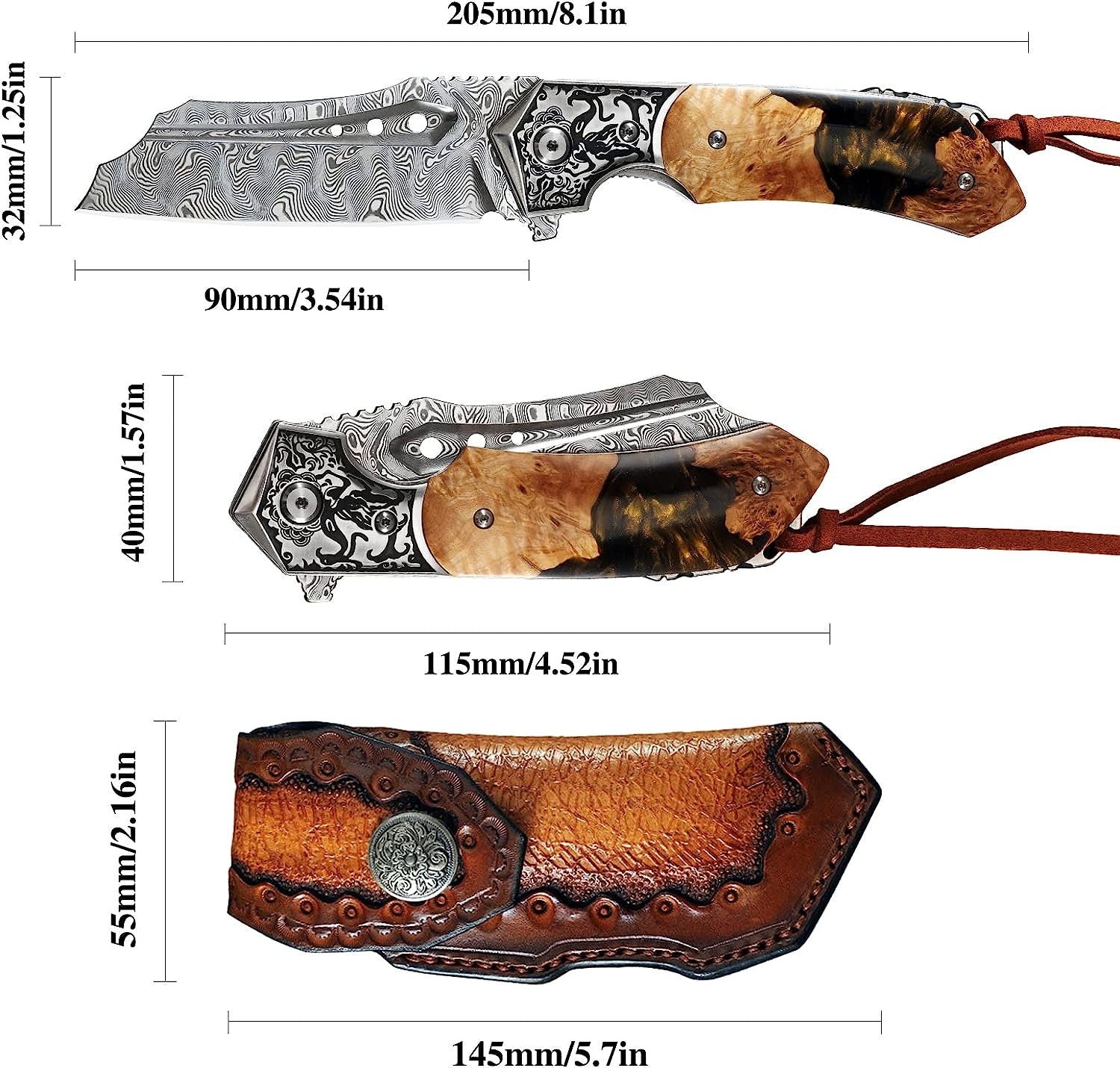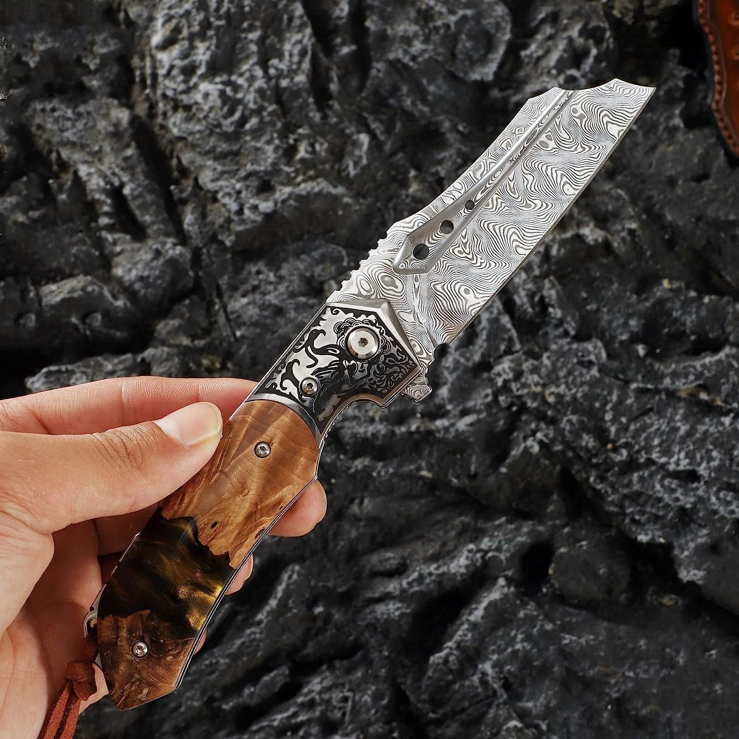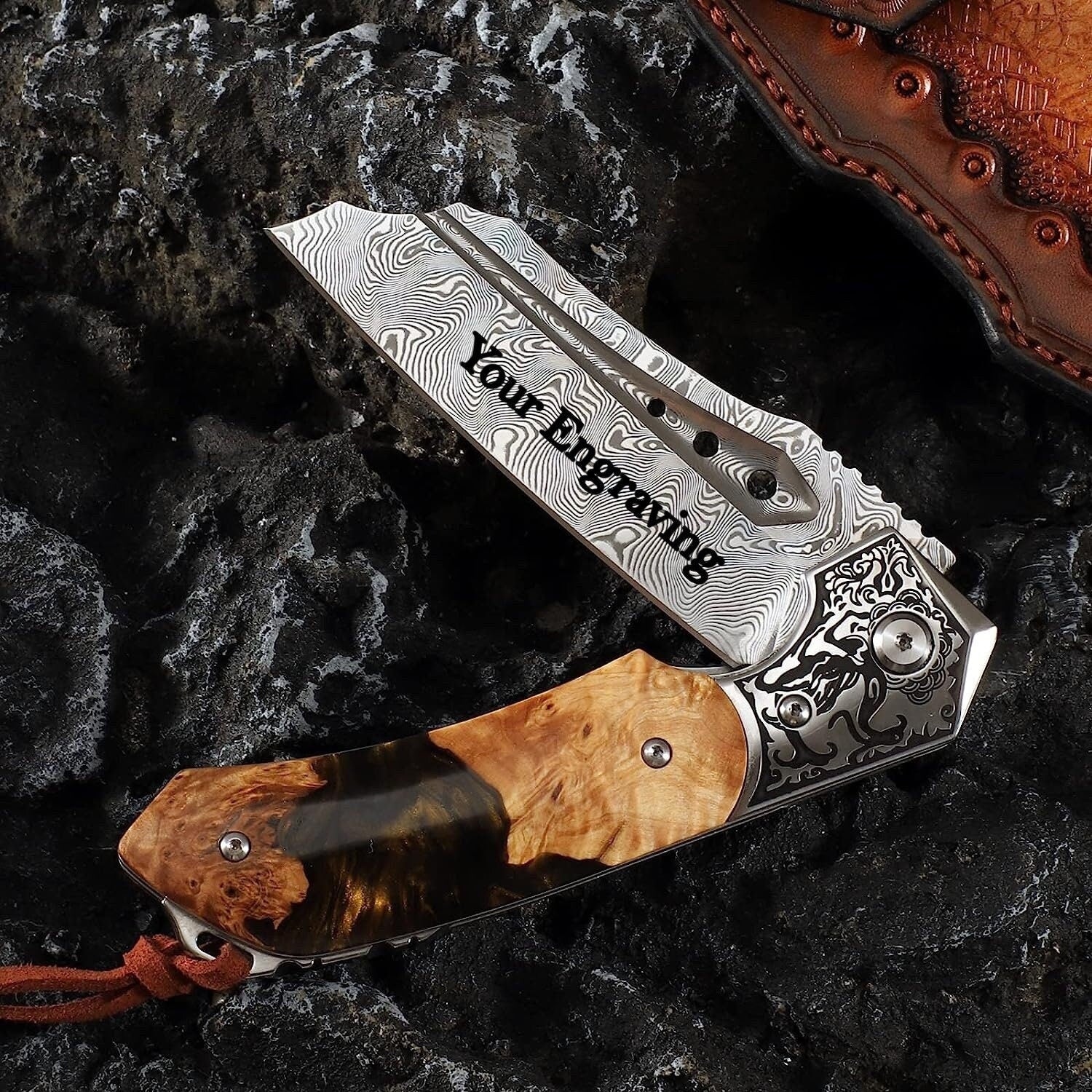Engraved VG10 Damascus Pocket Knife, Resin & Walnut Wood Handle Folding Knife, Gifts For Him Wedding Anniversary Husband Gift For Dad, NR03