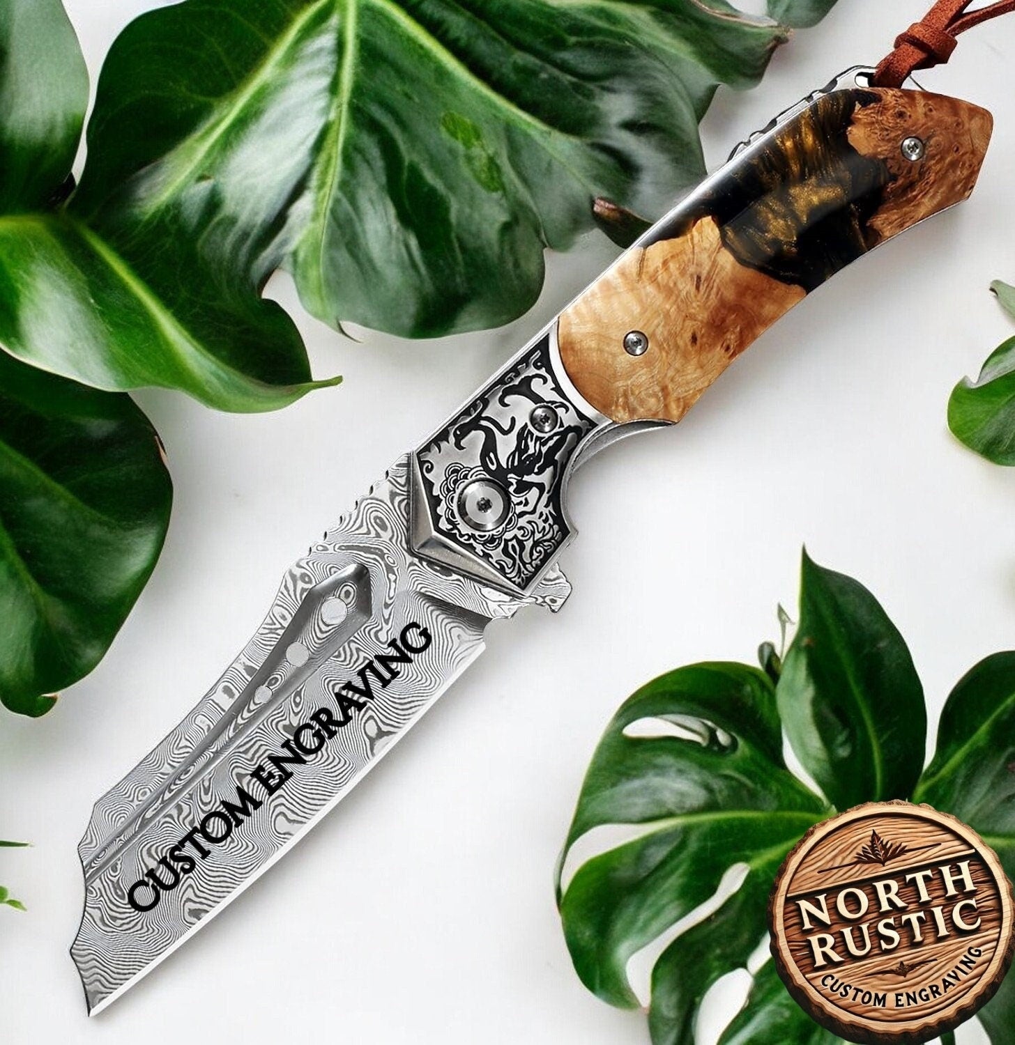 Engraved VG10 Damascus Folding Knife | Personalized Pocket Knife | Walnut Wood & Resin Handle Knife | Wedding Husband Anniversary Father Gift