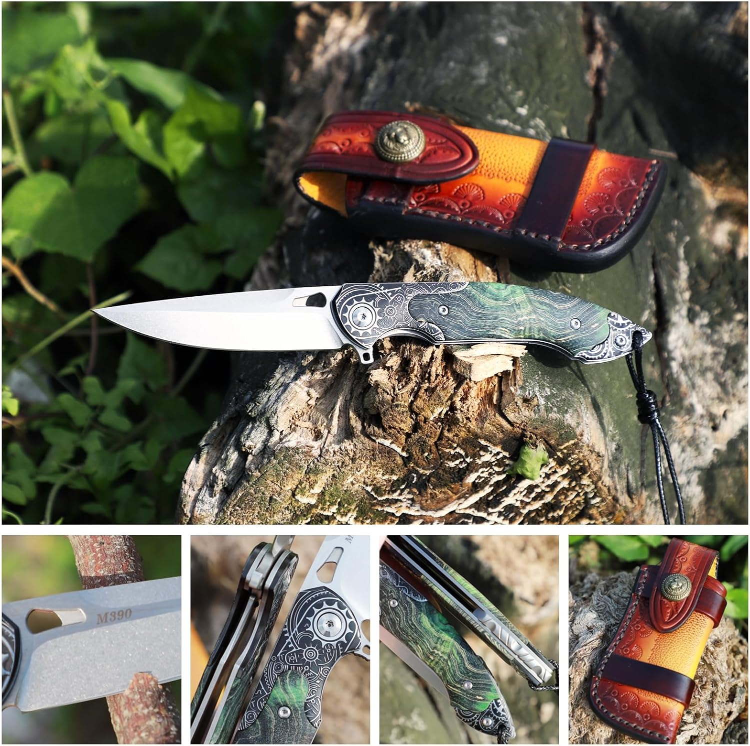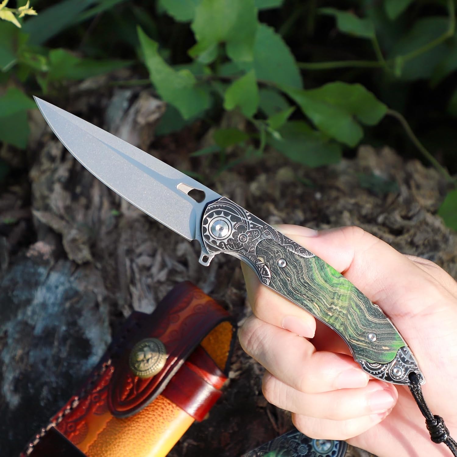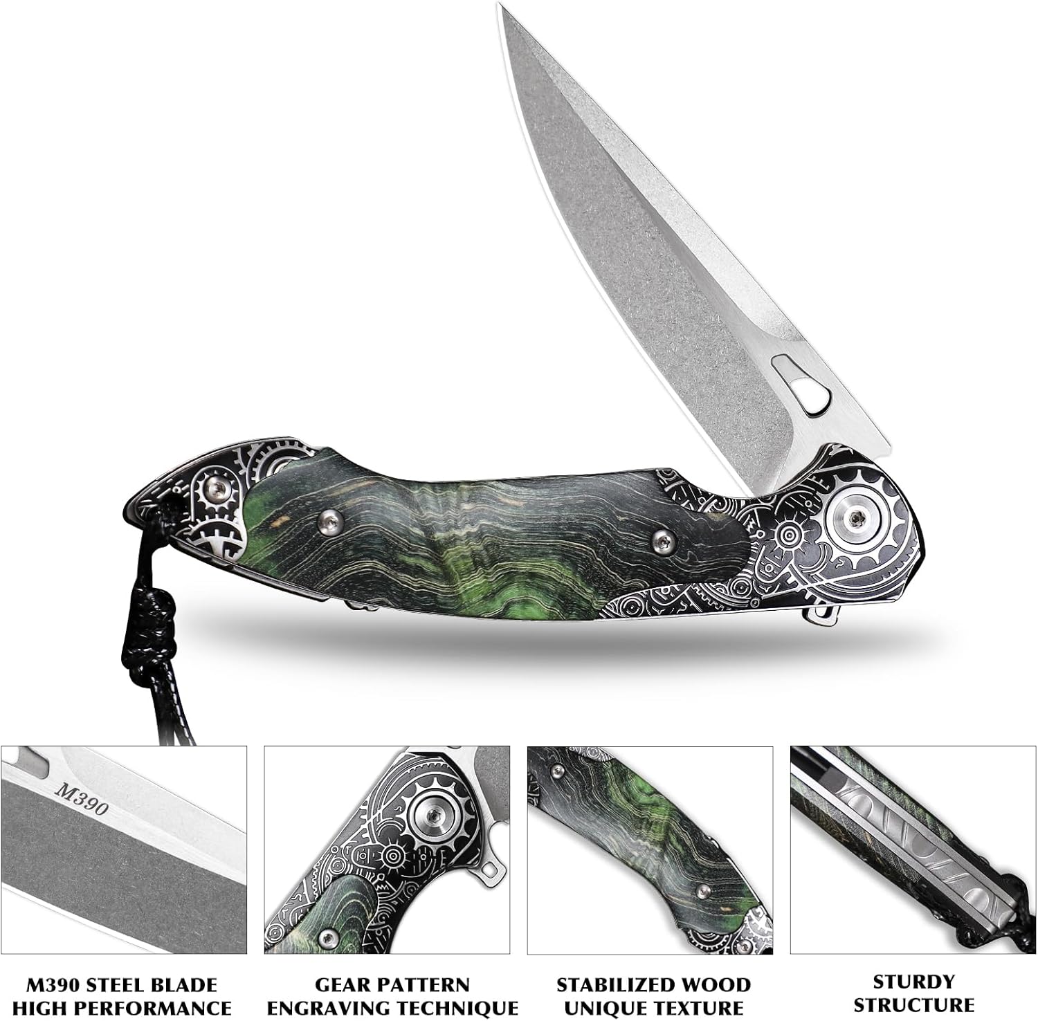 M390 Steel Pocket Knife Green Stable Wood Handle