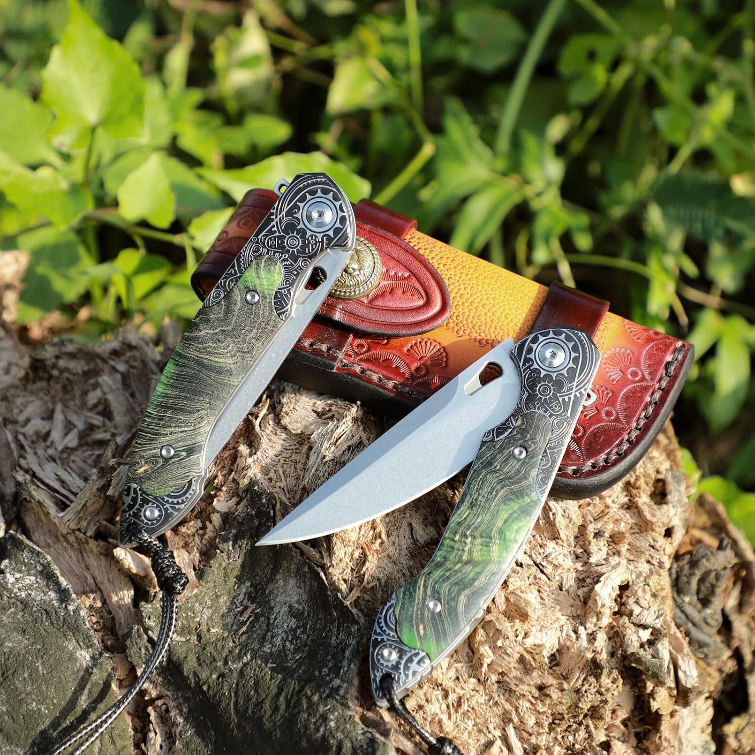 M390 Steel Knife, Green Stabilized Wood Handle | Handmade EDC Pocket Knife for Collectors