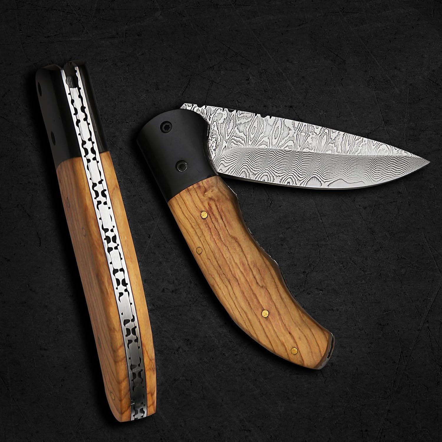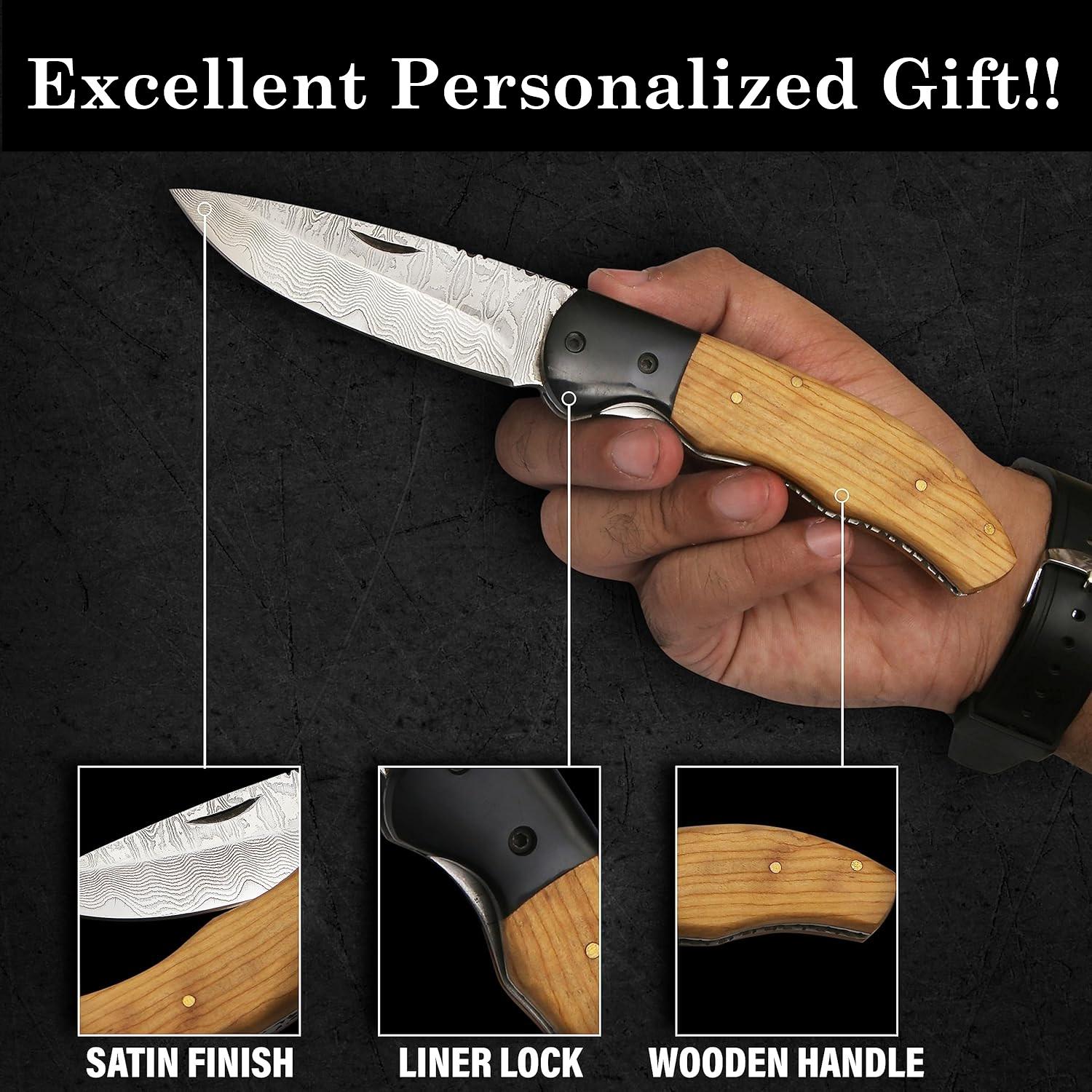 Olive Wood Personalized Folding Knife Gift Damascus Pocket Knife Groomsmen Gift Anniversary Wedding Handmade Birthday Gift for Him