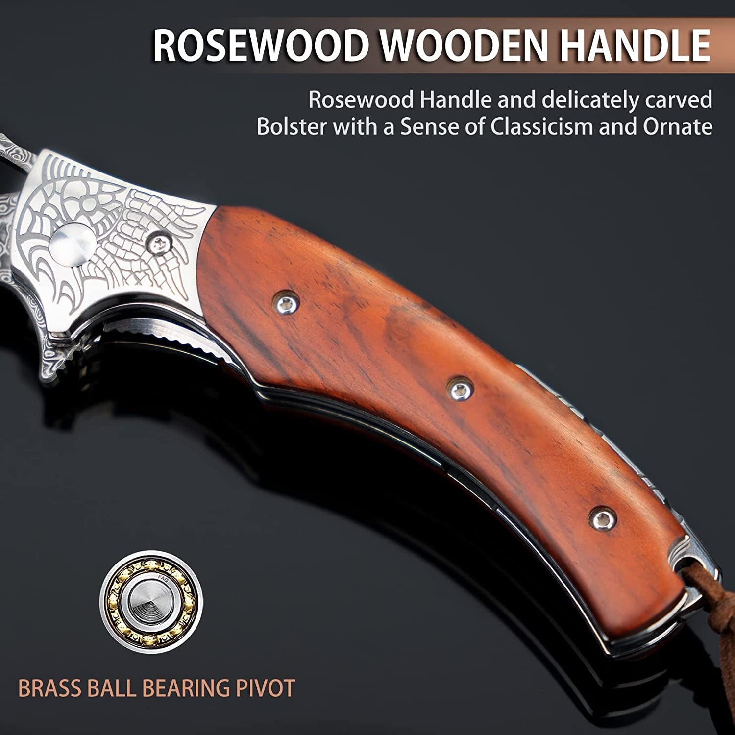 • Rosewood Handle: The handle of this pocket knife is adorned with beautiful Rosewood, known for its light weight and durable feel. Each handle is unique, displaying a mesmerizing play of colors and patterns, making it a true collector's item.