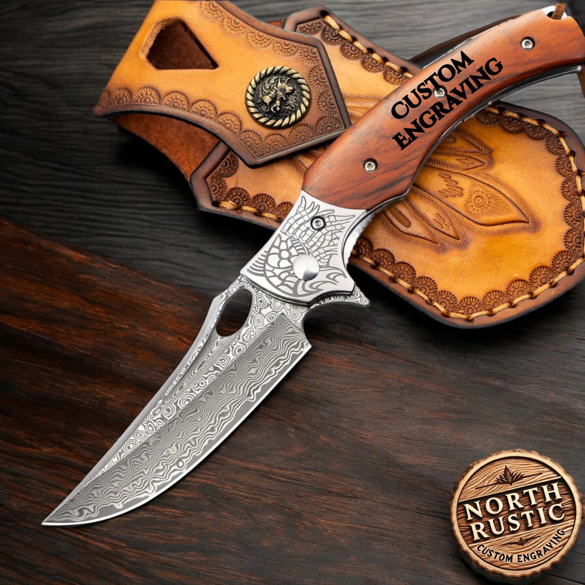 Engraved VG10 Damascus Folding Knife | Personalized Pocket Knife | Rose Wood Handle Knife | Wedding Husband Anniversary Father Gift
