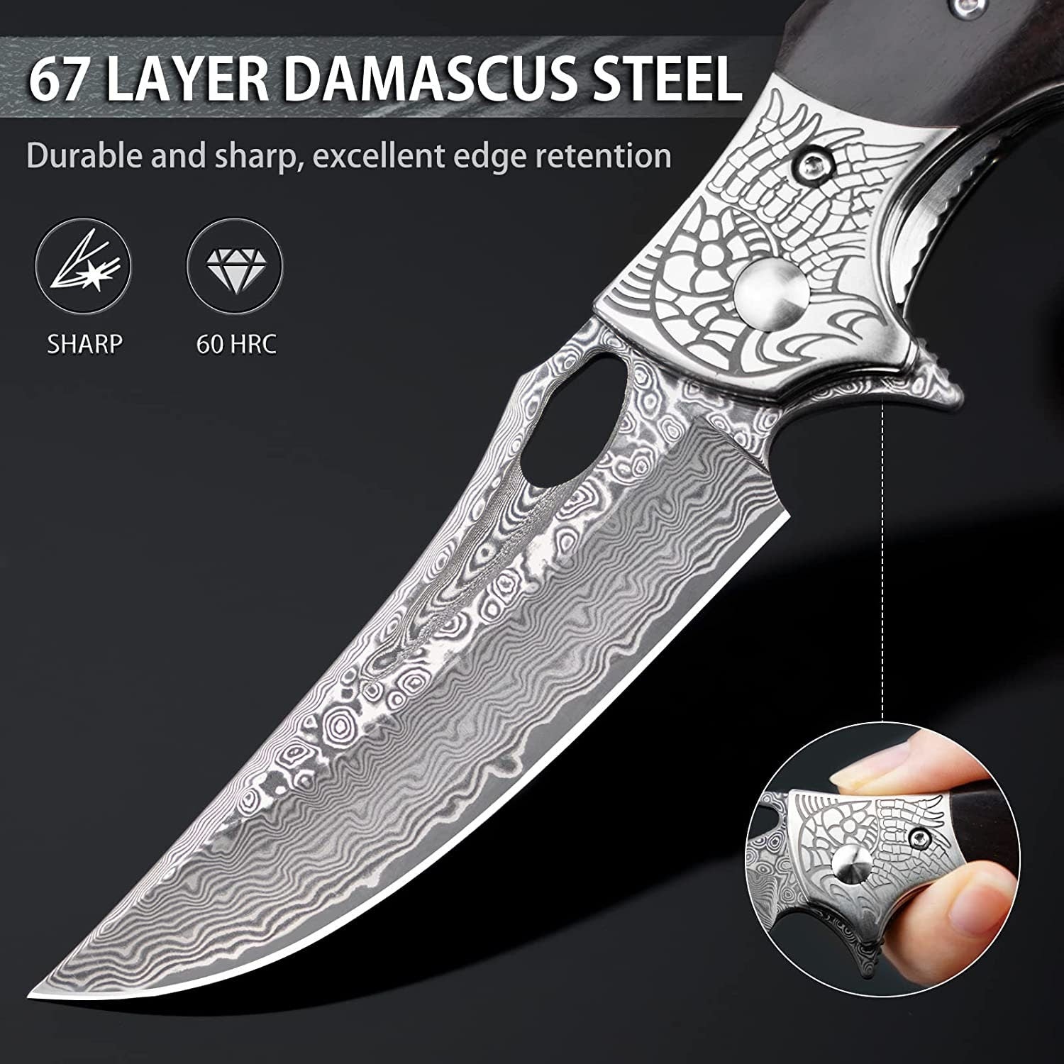 • Whether you're an avid outdoors enthusiast, a knife collector, or someone who appreciates the finer things in life, this Damascus Pocket Knife is a must-have addition to your collection. It's not just a tool; it's a statement of style and quality. Elevate your everyday carry with this stunning piece today!