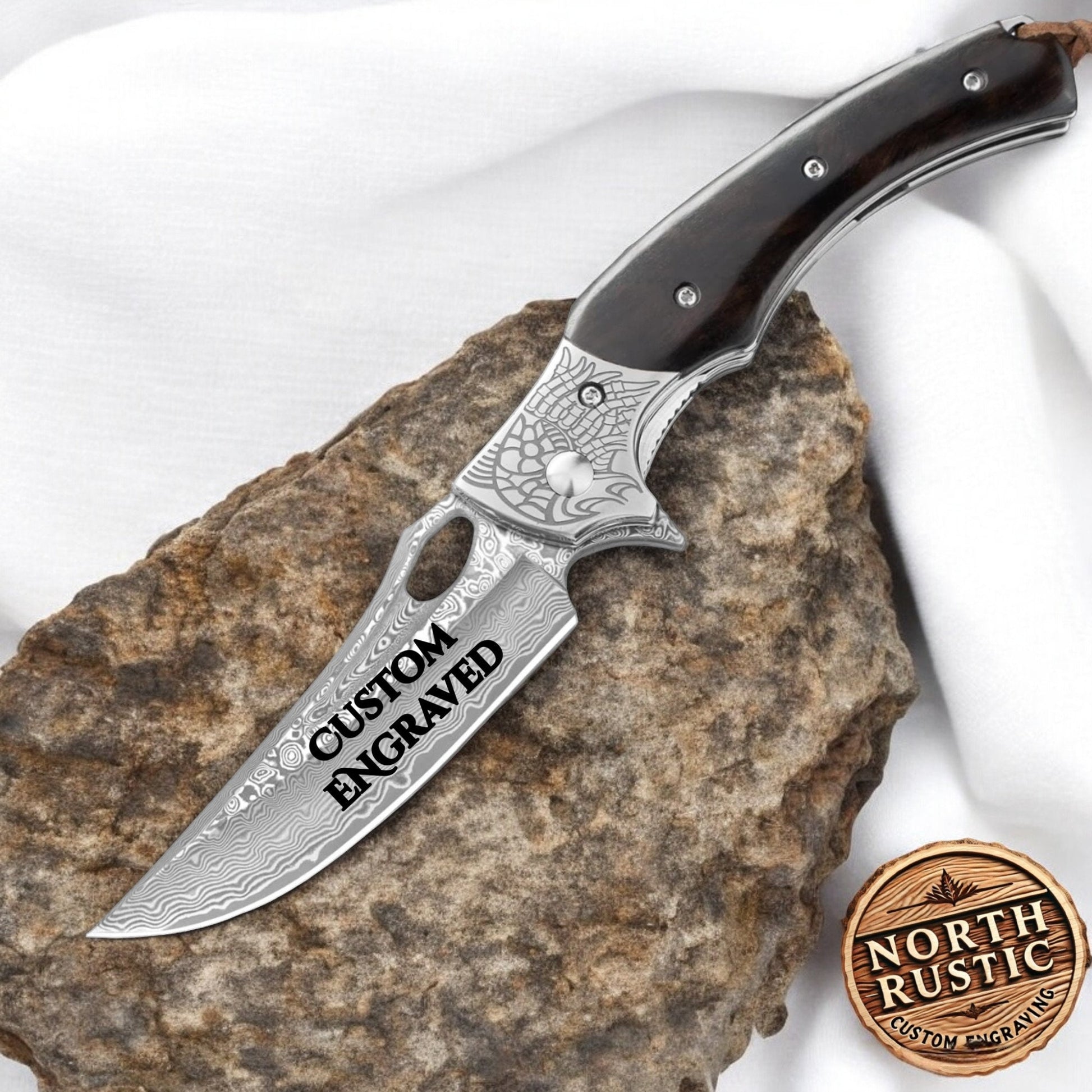 Engraved VG10 Damascus Folding Knife | Personalized Pocket Knife | Sandalwood Handle Knife | Wedding Husband Anniversary Father Gift