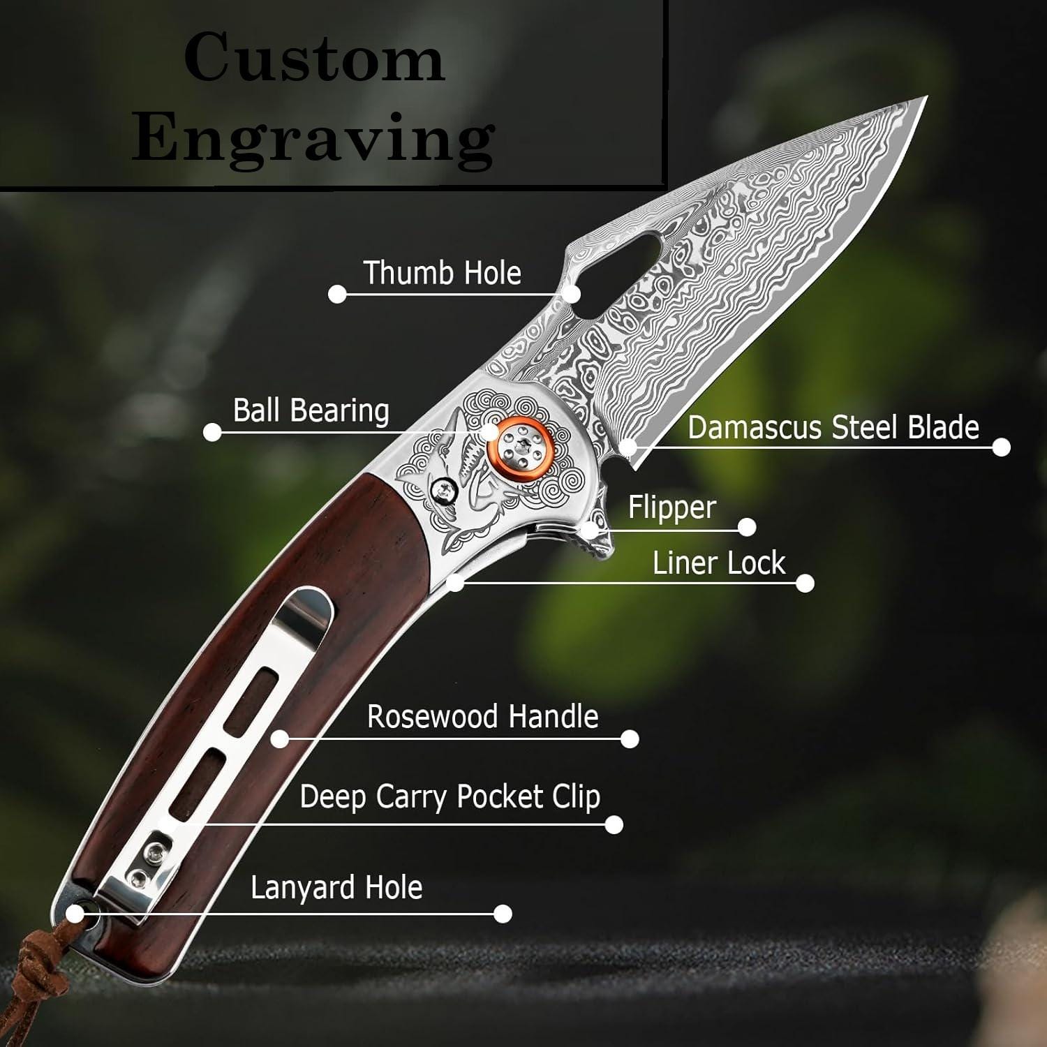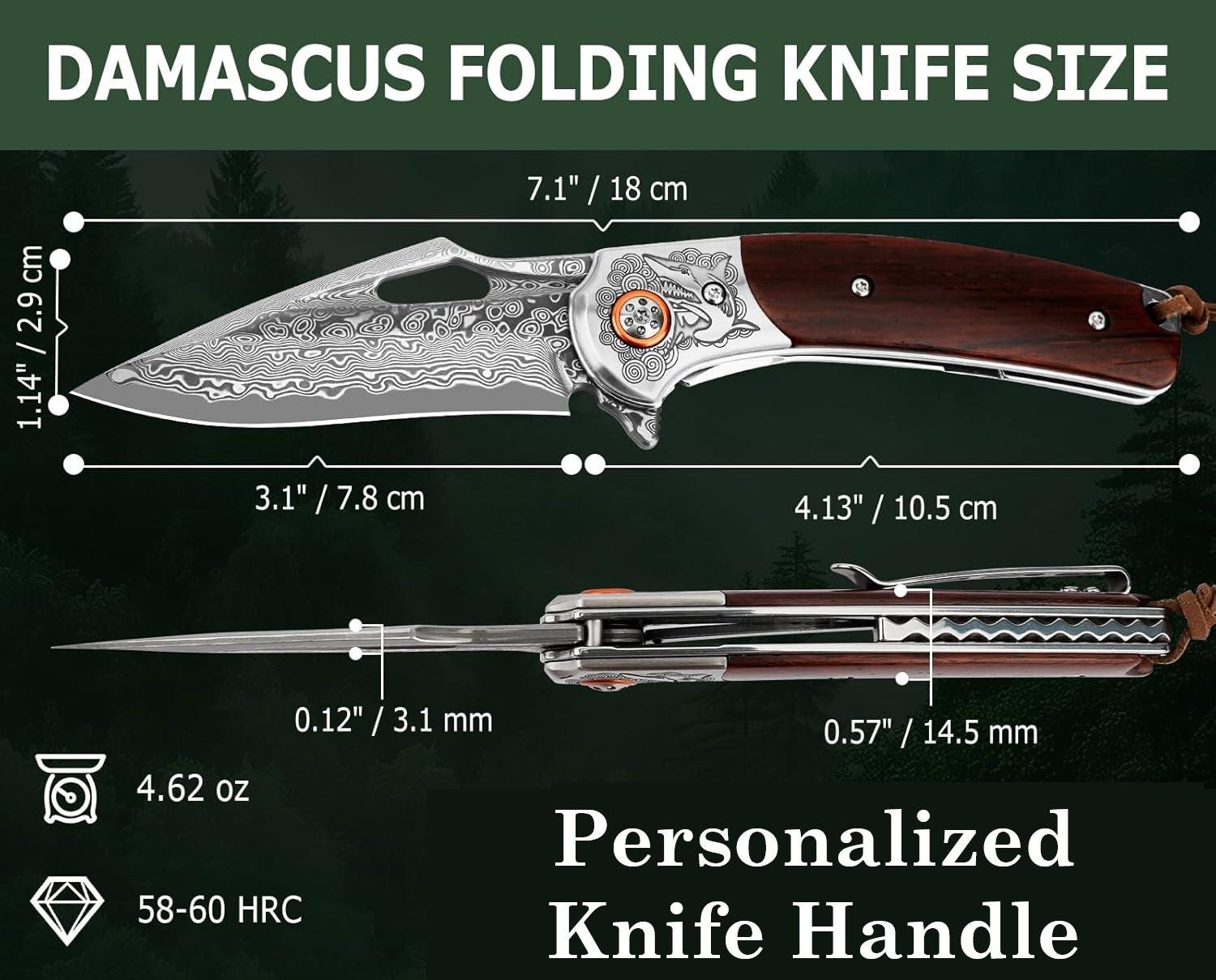 Engraved VG10 Damascus Folding Knife | Personalized Pocket Knife | Sandalwood Handle Knife | Wedding Husband Anniversary Father Gift