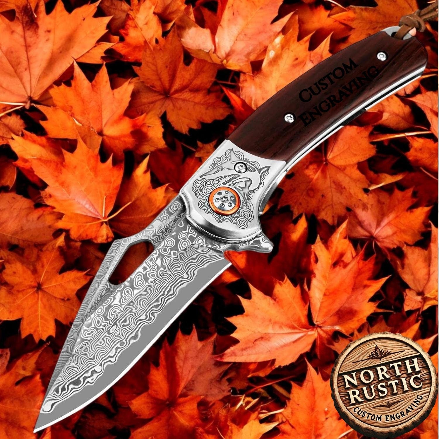 Personalized Damascus Pocket Knife Gift | Engraved Damascus Folding Knife | Custom Rose Wood Handle Knife | Husband Groomsmen Wedding Gift