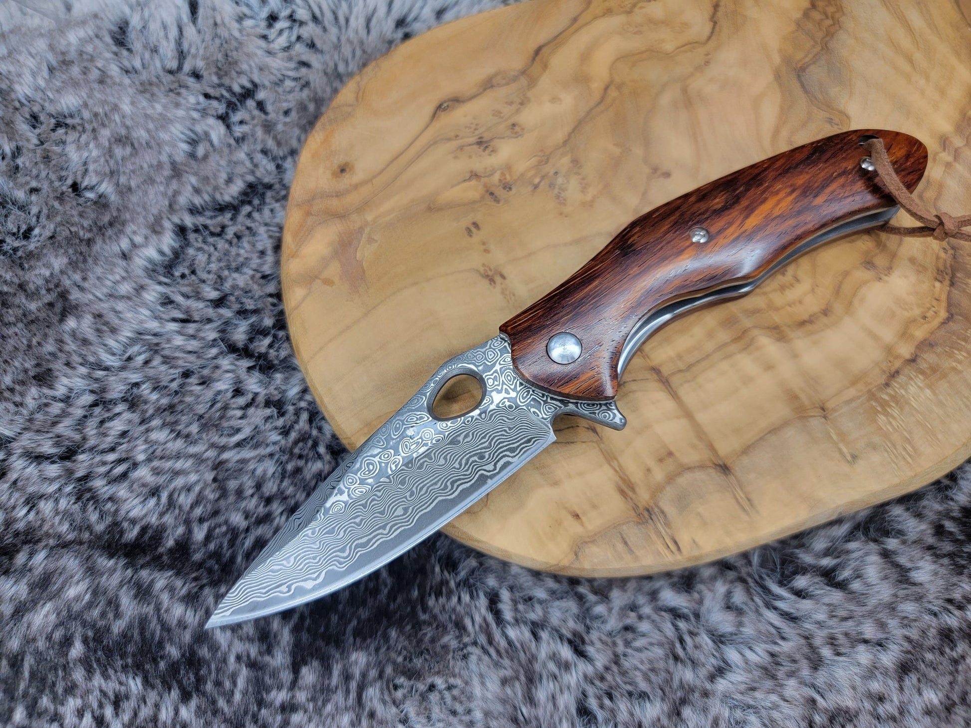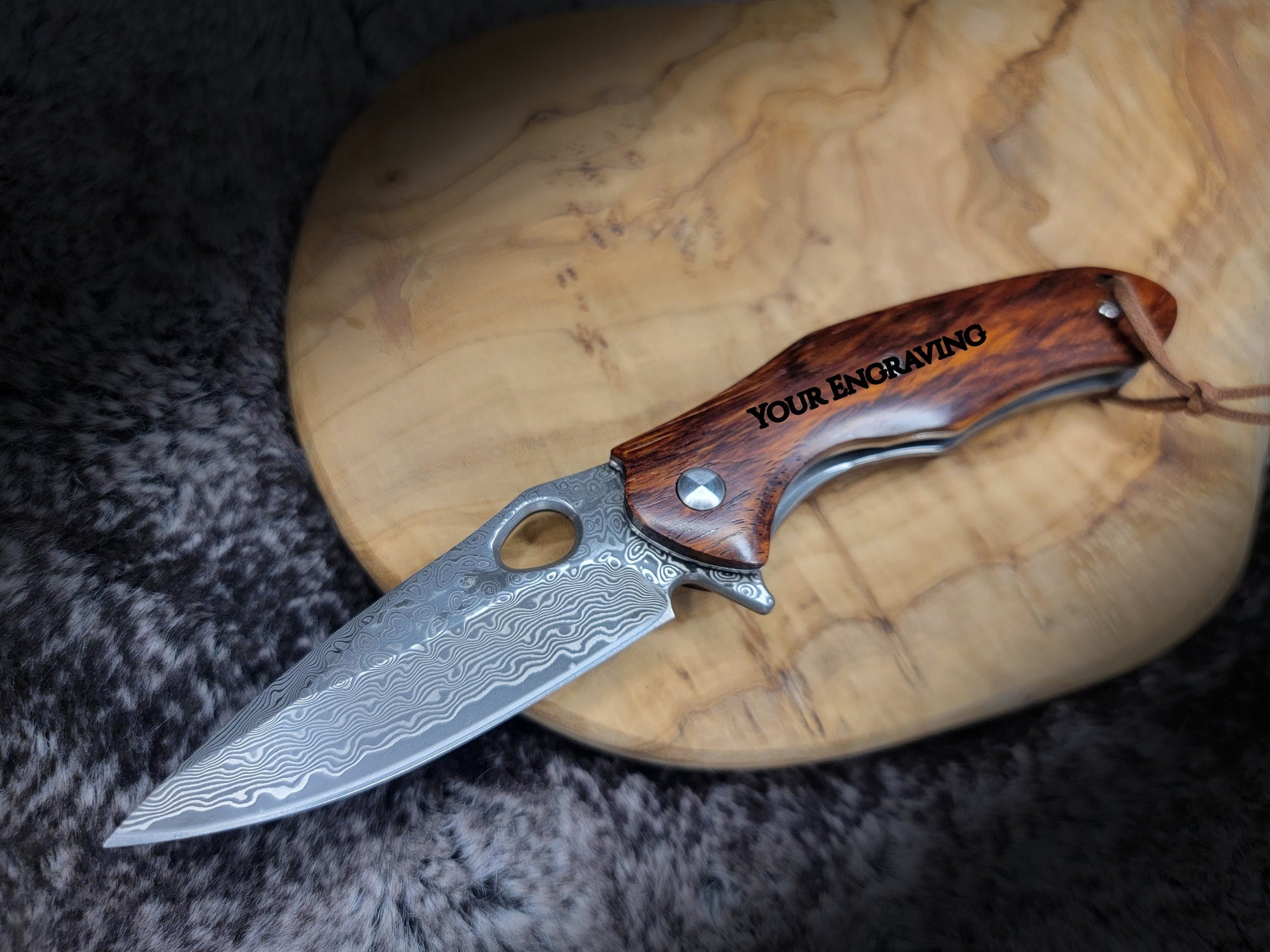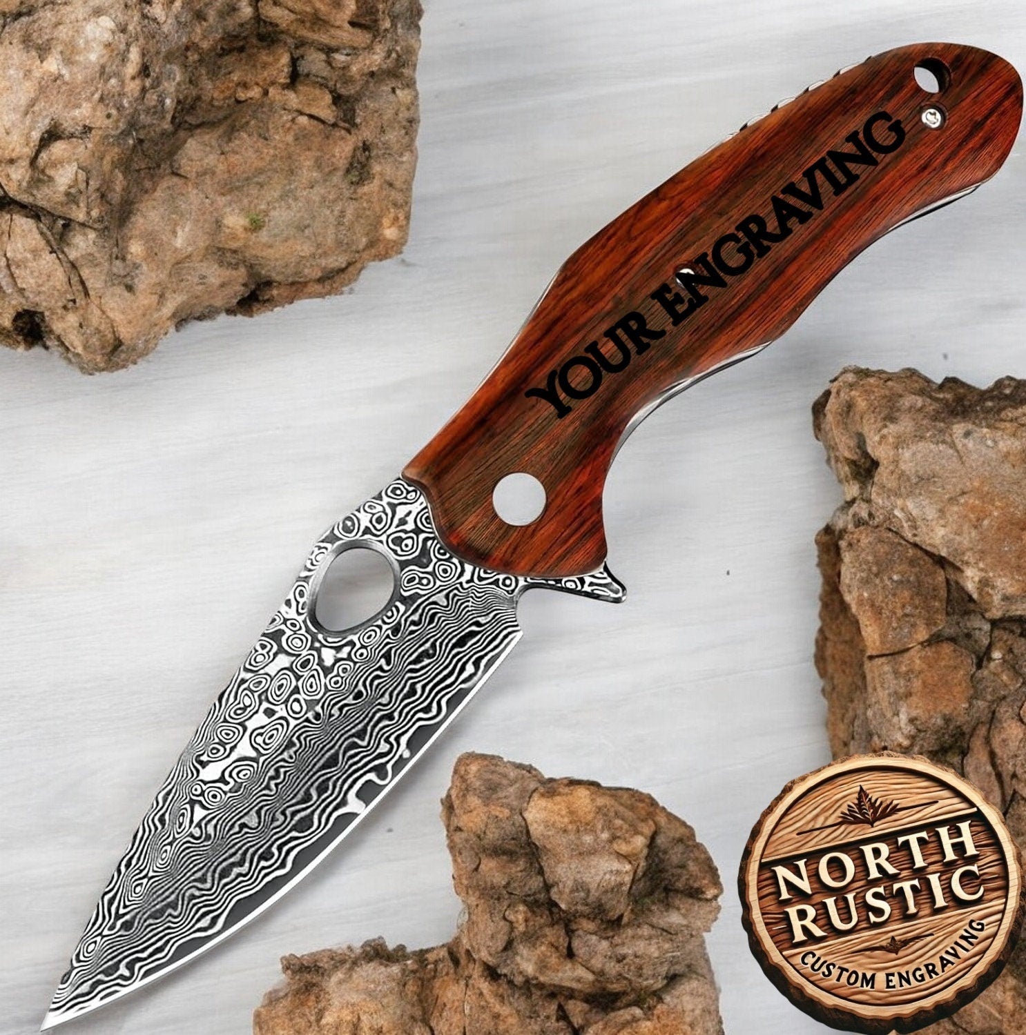 Engraved VG10 Damascus Folding Knife | Personalized Pocket Knife | Rose Wood Handle Knife | Wedding Husband Anniversary Father Gift