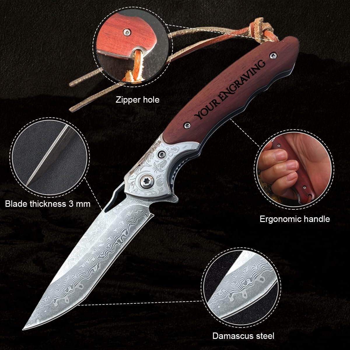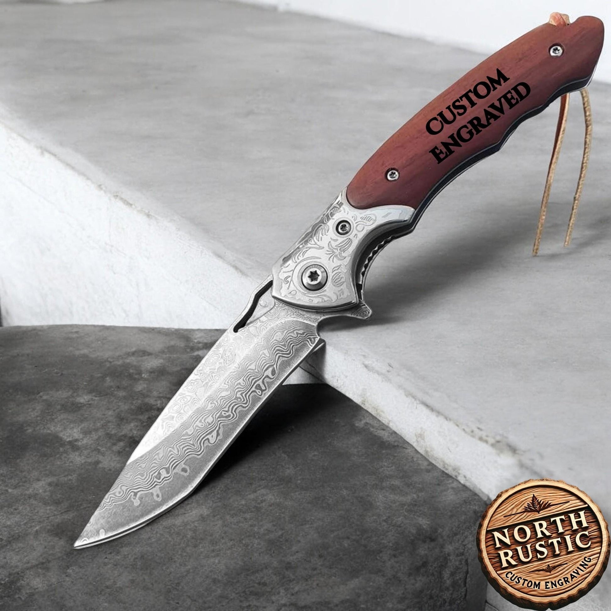 Personalized Engraved Damascus Pocket Knife, Handmade Custom Name Folding Knives, Damascus Steel Knife, Wood Knife Gift, Gift For Dad