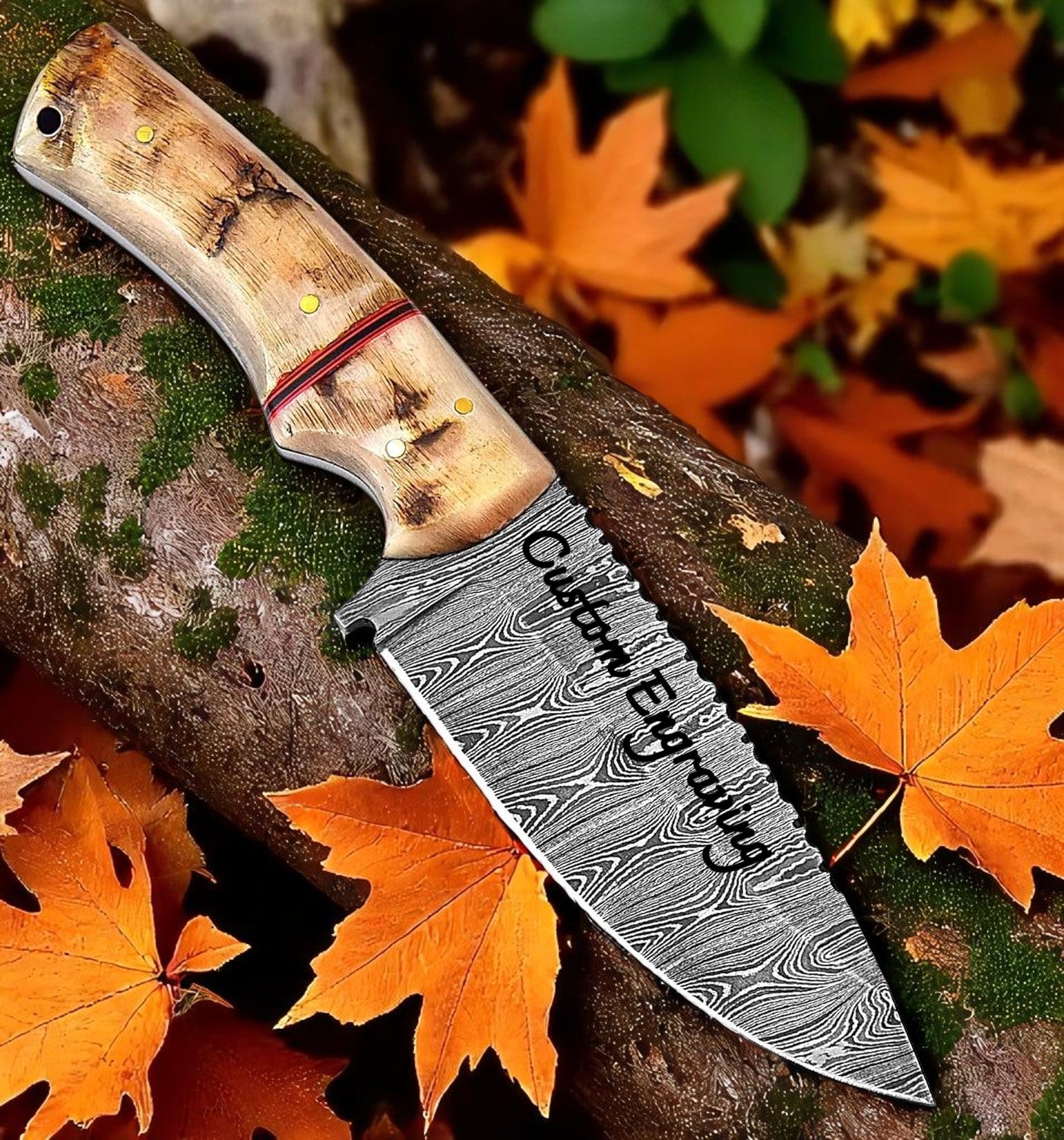 Ram Horn Handle, Engraved Damascus Hunting Knife, Personalized Hunting Knife, Custom Engraving Gift Father's Day Gift For Dad