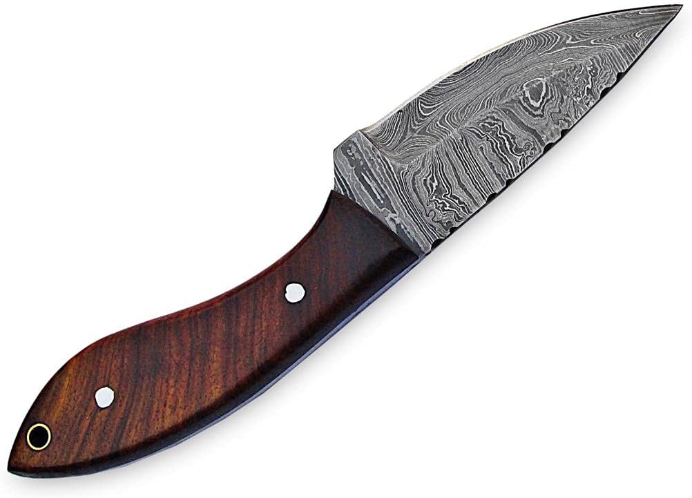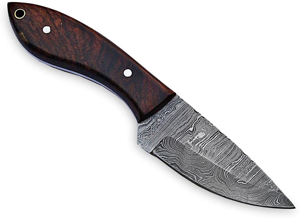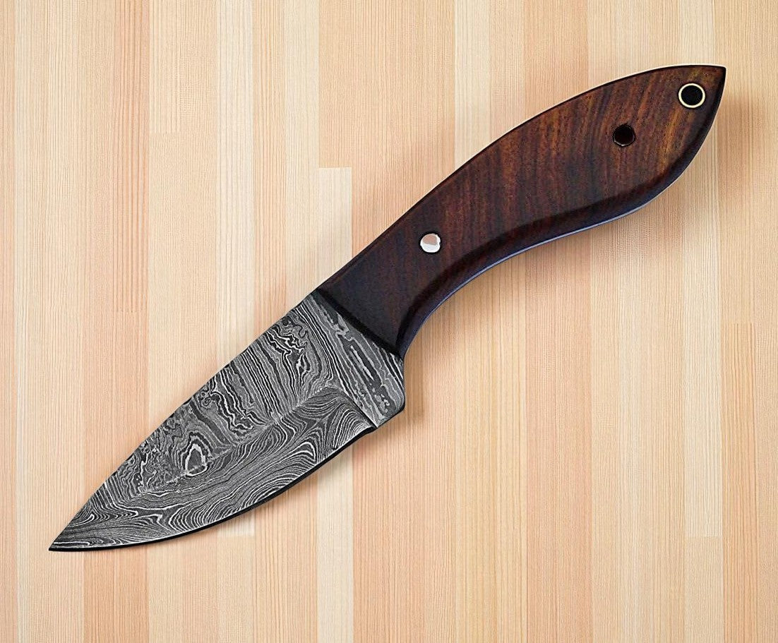 Damascus Hunting Knife, Rose Wood Handle | Custom Engraved Knife with Sheath, Handmade Fixed Blade Skinner | Gift for Hunter, Dad, Him