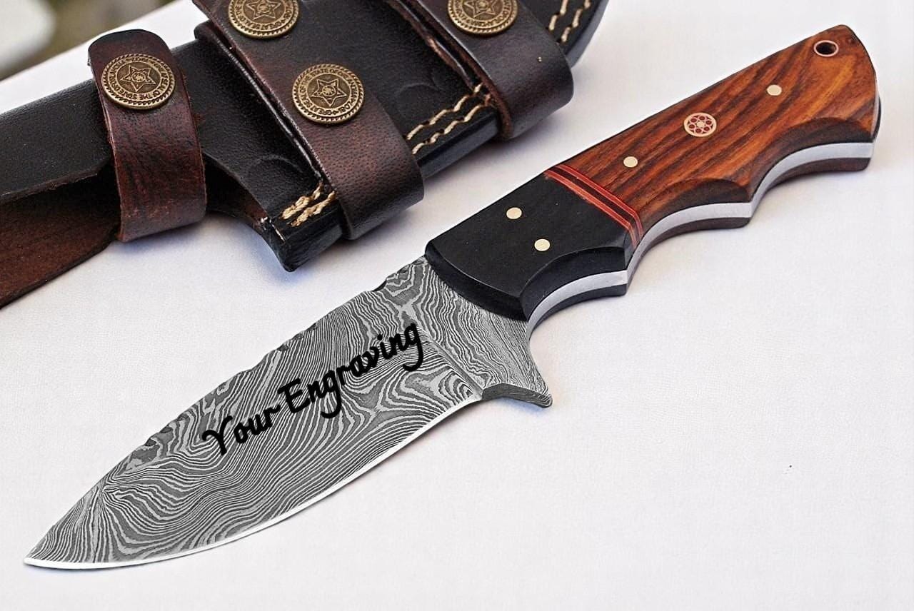Rosewood Handle Engraved Knife – Personalized Damascus Hunting Knife – Groomsmen Gift, Fathers Day, Wedding Gifts, Husband Anniversary