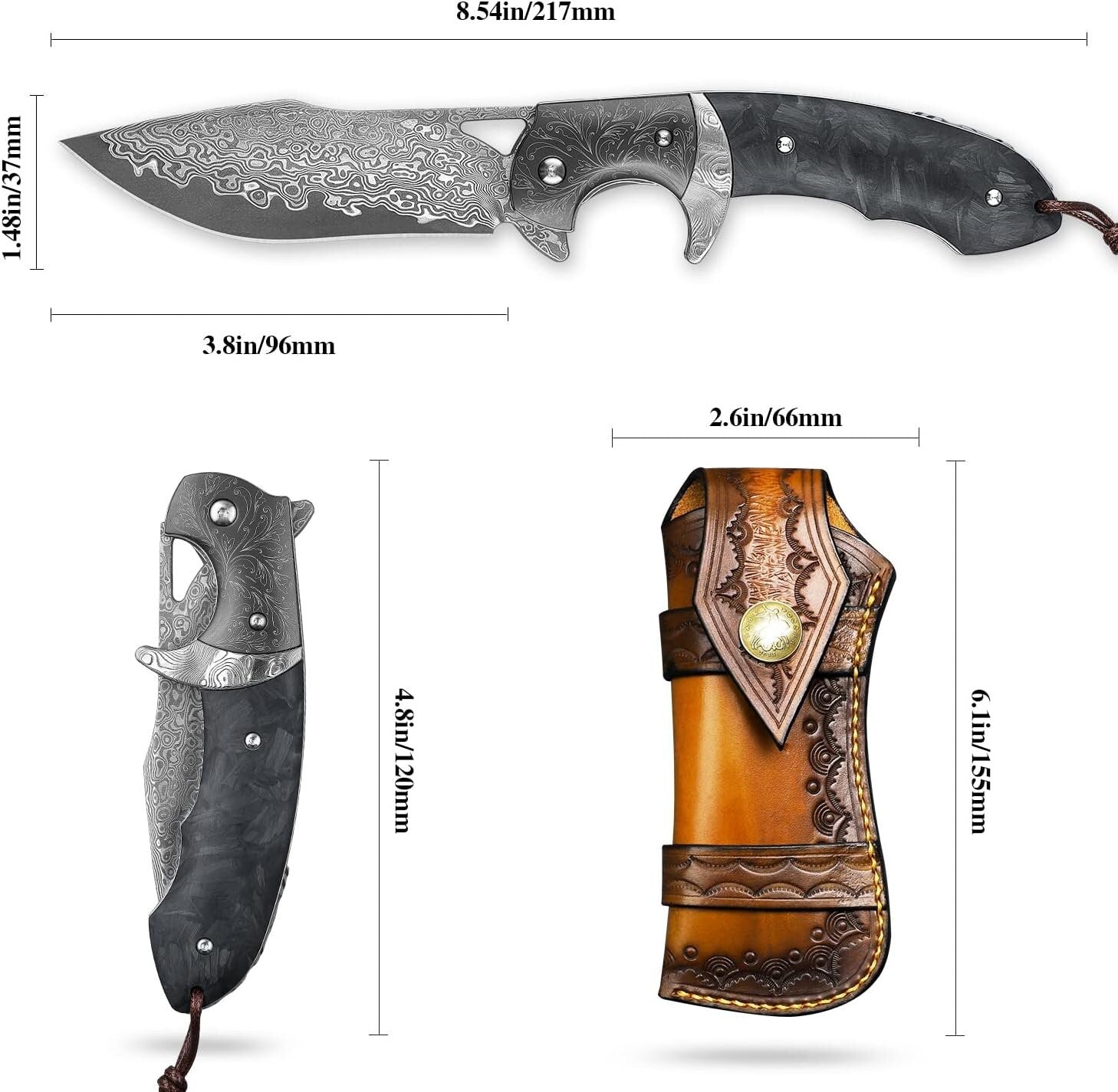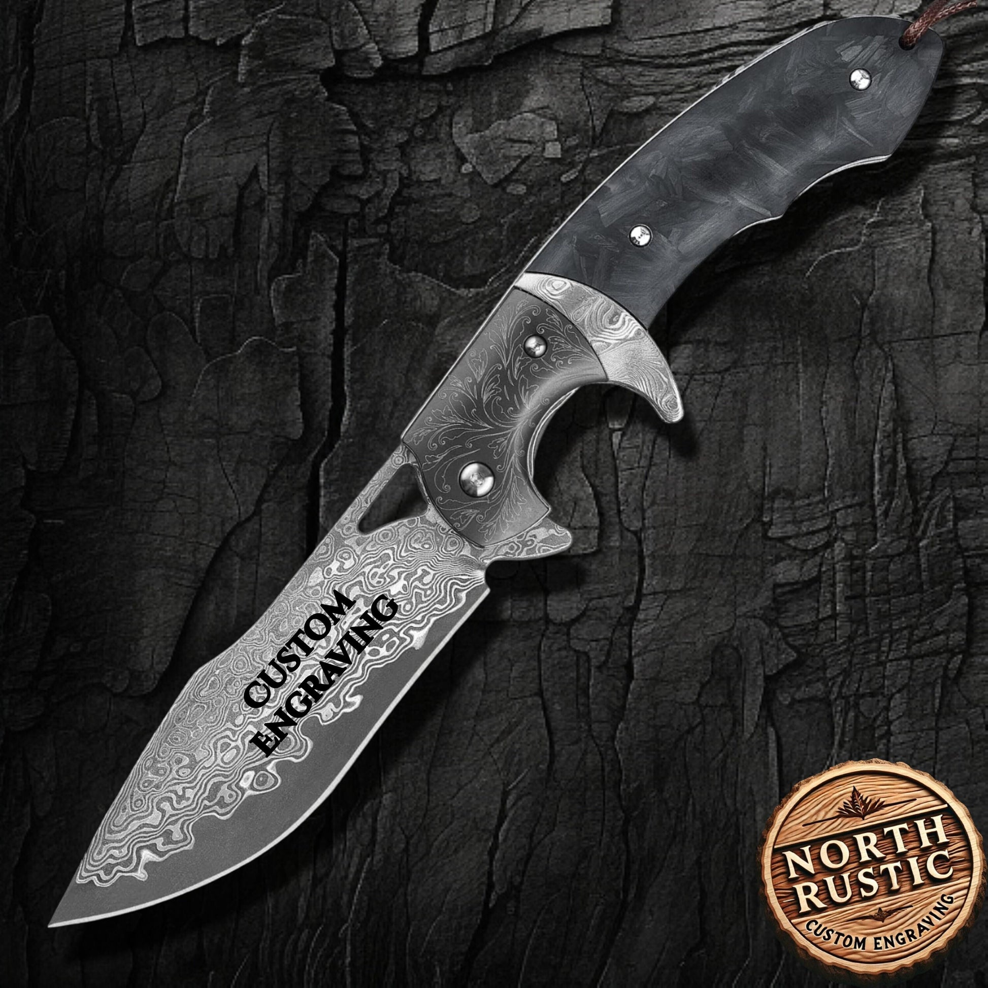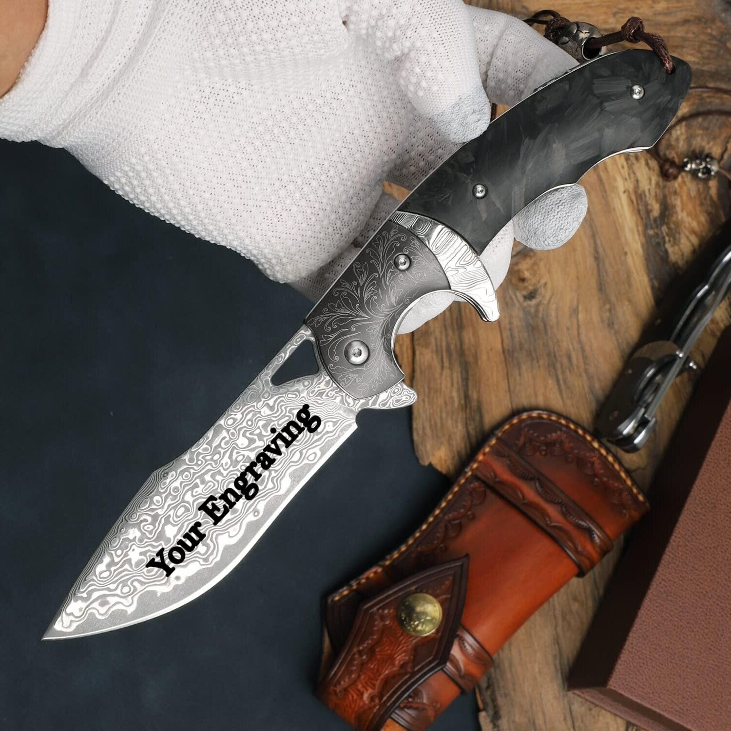 Engraved VG10 Damascus Folding Knife | Personalized Pocket Knife | Carbon Fiber Handle Knife | Wedding Husband Anniversary Father Gift